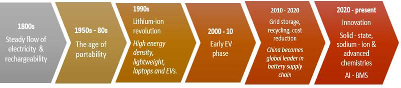 Batteries have come a long way since their inception in the 1800s (Figure. 1), now powering nearly every aspect of modern life, from smart gadgets and electric vehicles (EVs) to large-scale grid storage for renewable energy integration. Battery dependence will only intensify as the world shifts towards decarbonisation. In modern military operations, they support communications gear, night-vision devices, unmanned ground and aerial vehicles, submarines, wearable power sources for soldiers, and backup energy systems for forward bases and field hospitals. This widespread use underscores their dual and indispensable role.