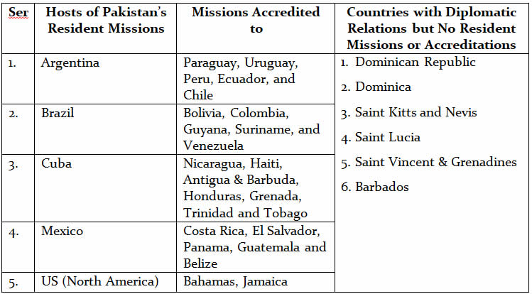 Diplomatically, Pakistan has resident missions in only four countries in the region: Brazil, Argentina, Cuba, and Mexico. These embassies are accredited to twenty-one countries, and Pakistan's US embassy is accredited to two countries in the region, as shown in Table 1. The resident missions are not adequately staffed and lack defence sections, except the mission in Brazil, while the embassy in Cuba lacks a commerce section.