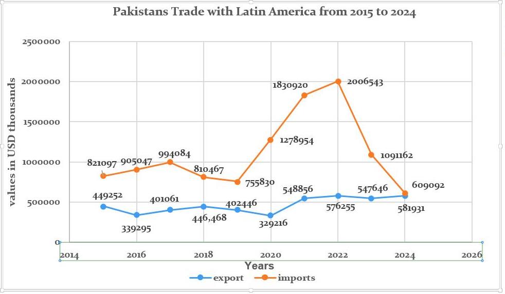 Economically, while there are signs of improvement in trade, Pakistan’s engagement with Latin America remains unsatisfactory, narrowly focused, and import-driven. The lack of diversification in export offerings, bureaucratic delays in formalising trade agreements like the PTA or FTA with MERCOSUR, and weakness in aligning with market demands reveal deeper issues in Pakistan’s external economic strategy. This strategic neglect is primarily underscored by a lack of awareness about the Latin American market, leaving it untapped. In the evolving world order characterised by the decline of unipolarity, the emergence of multipolarity, geopolitical competition, and trade wars among major powers such as China and the USA, there is an increasing need for international partnerships to explore new options and reduce dependence on conflicting powers. Hence, Latin America should not remain a missed opportunity but be repositioned as an essential component of Pakistan's market diversification and South-South cooperation agenda. To that end, a “Pivot to Latin America' policy may be required, focusing on developing stronger diplomatic, trade, and defense ties with the region.