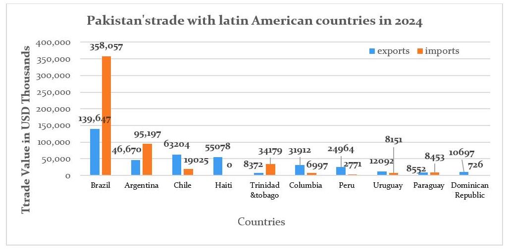 Graph 2 shows Pakistan's trade with Latin American countries in 2024. Pakistan has relatively more trade with countries like Brazil, Argentina, Chile, Haiti, Colombia, Trinidad, and Peru. There is a trade deficit with major trading partners like Brazil and Argentina, although exports to these two are higher than to other countries. The negligible trade with other countries indicates that the region has been unexplored.