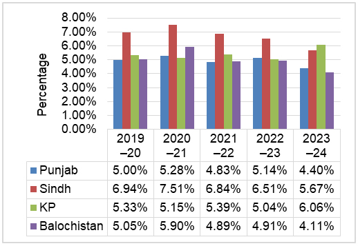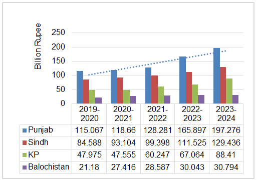 Punjab spends the most on police, but its percentage allocation is declining, yet it maintains the highest conviction rate. Sindh allocates the highest percentage, but conviction rates lag spending. KP’s percentage allocation is gradually increasing, but it is not having a positive impact on the conviction rate. Balochistan’s spending remains stable, but its percentage share is decreasing and maintains a low conviction rate.
