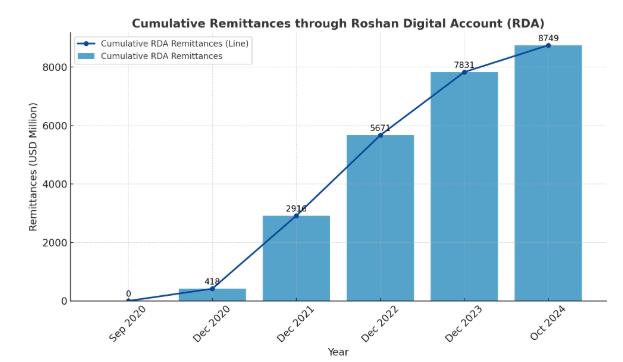 The graph illustrates a steady upward trend in cumulative remittances through the RDA from September 2020 to October 2024, increasing from zero to US$8,749 million. The period from 2020 to 2022 saw rapid growth, driven by strong early adoption, policy incentives, and increased trust among overseas Pakistanis. While remittances continued to rise, the growth rate began to slow after 2023, suggesting market maturity and potential saturation. Despite this, the RDA has maintained its role as a reliable remittance channel.