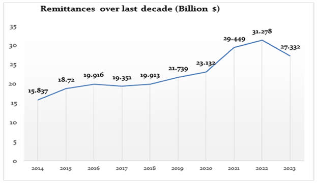 In 2022, a significant portion of remittances was funnelled into the Hundi market, reportedly due to the government's artificial cap on the dollar-to-rupee exchange rate. This situation led to the first decline in annual remittances since 2017, with a decrease observed in fiscal year 2023. Analysts and currency dealers attributed the US$4.25 billion drop in remittances in the previous fiscal year to the activities in the Hundi market, as illustrated in the graph.