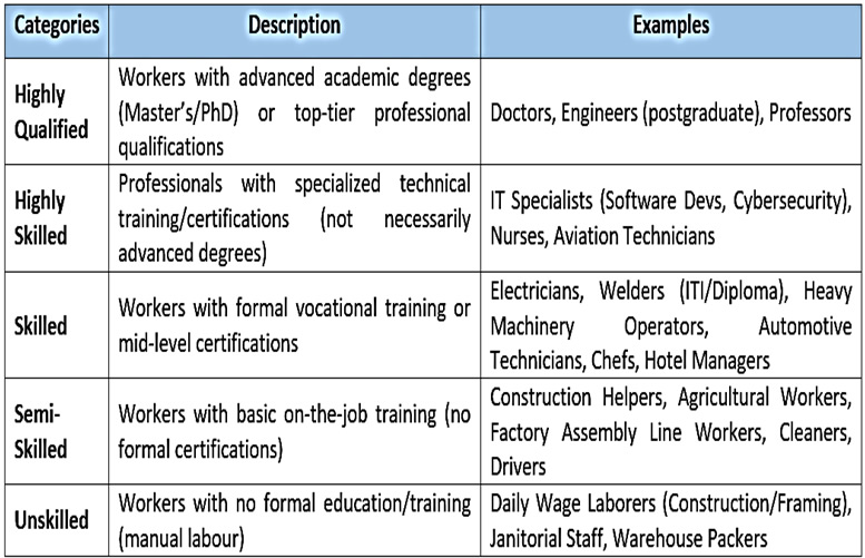 The Ministry categorises overseas workers into five distinct groups; as shown in the table below depending on their level of education, vocational training, and professional certifications.