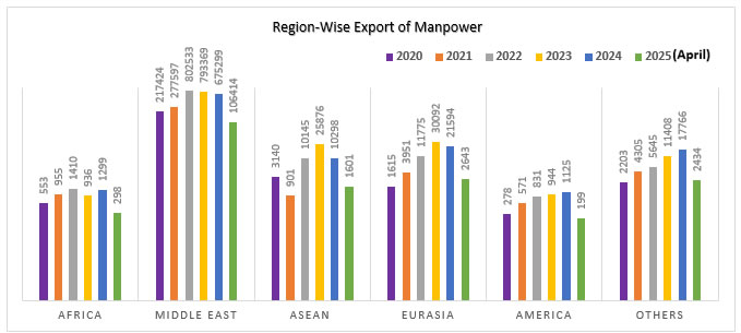 The graph highlights fluctuations in manpower exports, with a steady increase in labour exports from 2020, peaking in 2022 & 2023, with unskilled and skilled workers making up the largest share, but it also indicates a sharp decline in 2025. However, the region wise supply of manpower indicates that the Middle Eastern region has been the top destination for Pakistani manpower, with KSA absorbing the highest number. While Middle Eastern nations continue to be the primary labour markets, migration to non-traditional markets in Europe, Africa, and East Asia remains marginal as shown in the graph below.