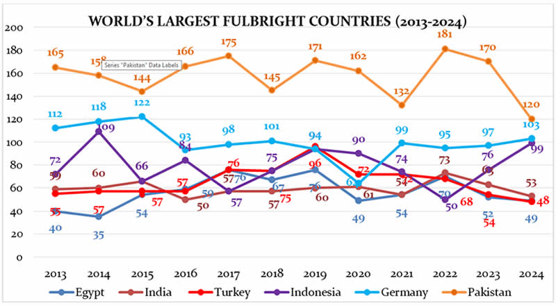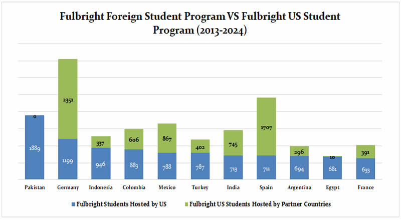 Pakistan's unique position in the Fulbright Program, lacking reciprocity in hosting US students, also warrants attention. Pakistan is the only top Fulbright recipient country exempt from hosting US students under the ‘Fulbright US Student Program.’ This absence of two-way exchange limits Pakistan's opportunity to shape its global narrative and foster deeper mutual cultural understanding.