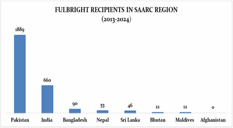 Since its inception in Pakistan in 1951, the Fulbright Program has awarded scholarships to nearly 3,000 Pakistani nationals. In 2022 alone, Pakistan was the largest recipient of Fulbright scholarships globally, with 189 scholarships worth $18.44 million. Graph 2 below indicates that Pakistan has been the largest recipient of Fulbright scholarships in the SAARC region over the last decade.