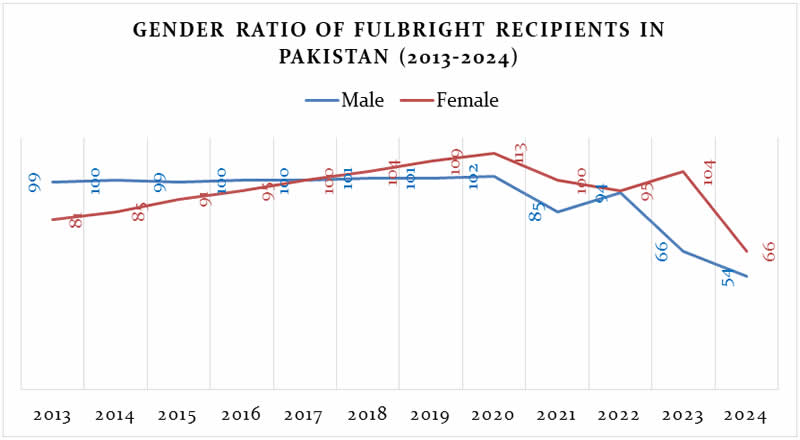 Graph 6 below shows the gender ratio of Fulbright recipients in Pakistan. Until 2018, approximately half of the recipients of the Fulbright Program were women; however, since 2018, the number of female recipients has exceeded that of their male counterparts.