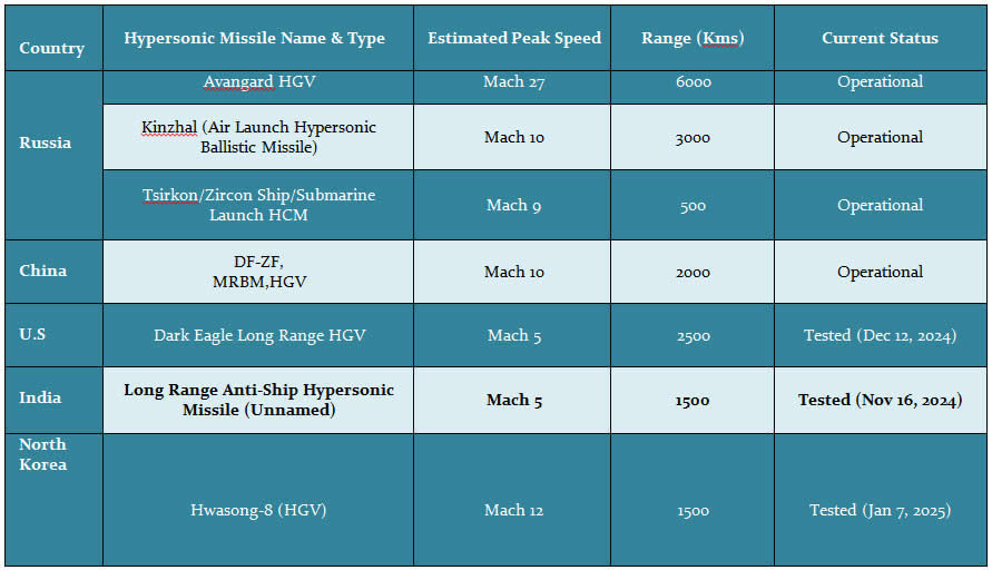 However, the US did not prioritise the pursuit of HWs; instead, it invested in parallel technologies. The status of the current global hypersonic inventory is as follows.