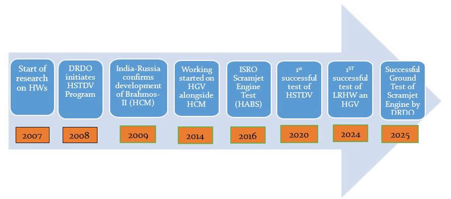 On November 16, 2024, India’s DRDO successfully tested the country’s first Long Range Hypersonic Missile (an anti-ship missile) from Abdul Kalam Island near the coast of Odisha. The missile is reported to have a range of 1500 km. It is capable of carrying both conventional and nuclear payloads. Its range covers the whole of Pakistan and essential choke points in the South China Sea (SCS). This test shows India’s aggressive Military modernisation, ultimately threatening regional stability. The following timeline depicts the development of the Indian Hypersonic Weapon Programme.