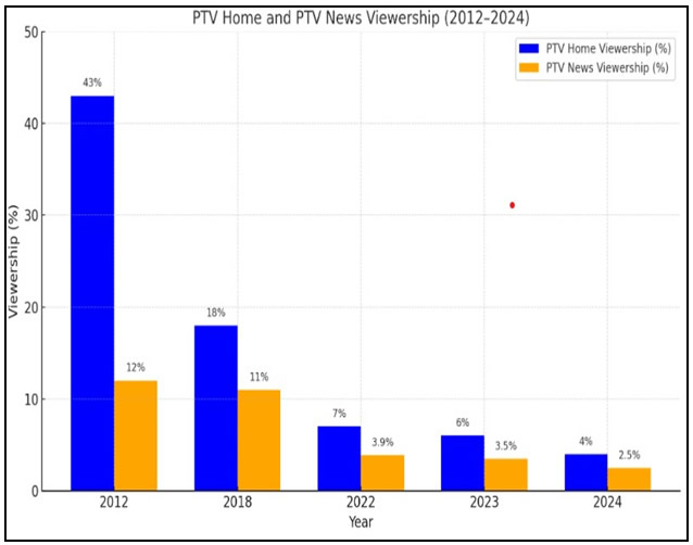 While PTV has a broad terrestrial and satellite footprint, it struggles to convert this reach into consistent audience engagement. In the 1990s, PTV held about 68% of total domestic TV viewership; however, (as illustrated in Graph 1), this dominance has eroded over time. Between 2012 and 2024, PTV Home’s audience share dropped from 43% to 4%, and PTV News declined by 75%.