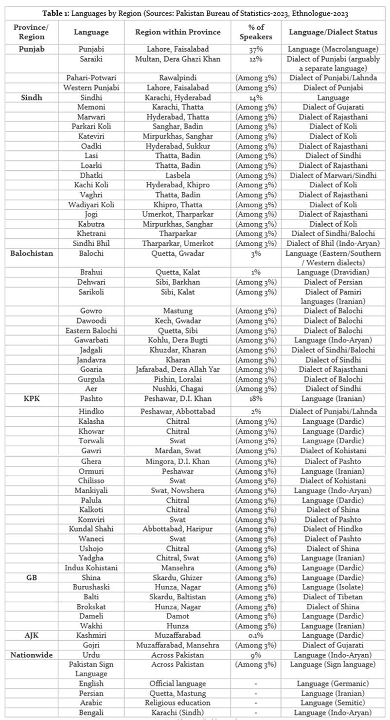 Pakistan is a country of 241 million people standing testimony to the dictum of unity in diversity manifested in 68 indigenous languages and 12 non-indigenous languages spoken in the country. The country’s linguistic composition is shaped by various historical factors, including the presence of distinct ethnic groups and their associated cultural traditions.