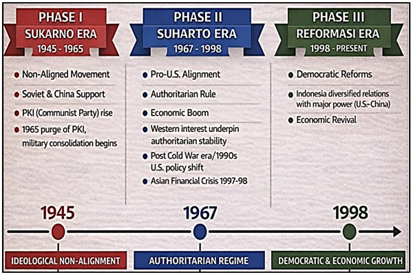Since its independence in 1945, Indonesia’s development has been shaped by both Cold and post-Cold War dynamics characterised by great-power rivalry. Indonesia's transformation, therefore, can be understood by considering three distinct phases of its history.