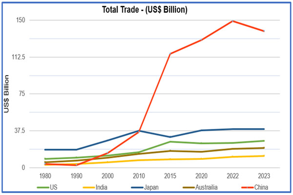Parallel to its engagement with the U.S., Indonesia rapidly deepened economic cooperation with China after achieving democratic stability in 2004. Its net exports-imports have increased from $ 3.8 billion (2003) to $ 135 billion (2024) through the Comprehensive Strategic Partnership (CSP) under the Belt and Road Initiative (BRI-2013).