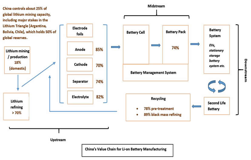 Consequently, China has emerged as the undisputed leader in the Li-on battery market. It controls over 75% of global Li-on battery production capacity, dominating most stages of the supply chain through state-supported vertical integration (Figure. 4). This includes upstream extraction and processing of critical minerals to midstream manufacturing of battery cells, modules, and packs, and finally to downstream integration in electric vehicles and energy storage systems, followed by end-of-life handling via recycling and second-life repurposing. Leading firms such as CATL, BYD, EVE Energy, and Tianqi Lithium are prominent players.