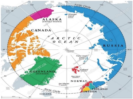 The Arctic covers an area of 14.5 million square kilometers centered on the North Pole. It comprises the Arctic Ocean, parts of Russia, Canada, the US, Iceland, Greenland, Finland, Sweden, and Norway. While the Arctic Ocean, particularly its central high seas beyond national Exclusive Economic Zones (EEZs), is considered a global common governed under UNCLOS, the broader Arctic region, which includes the land and maritime zones of the eight Arctic nations, is not formally designated as a global common.