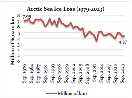 The Arctic sea ice loss (Figure 2) shows an alarming decline. This decrease over the years highlights the severe impact of global warming. Although yearly fluctuations occur, the overall trend confirms an accelerating ice loss. This signals broader climate instability and increases geopolitical interest in the region’s newly accessible routes and resources.