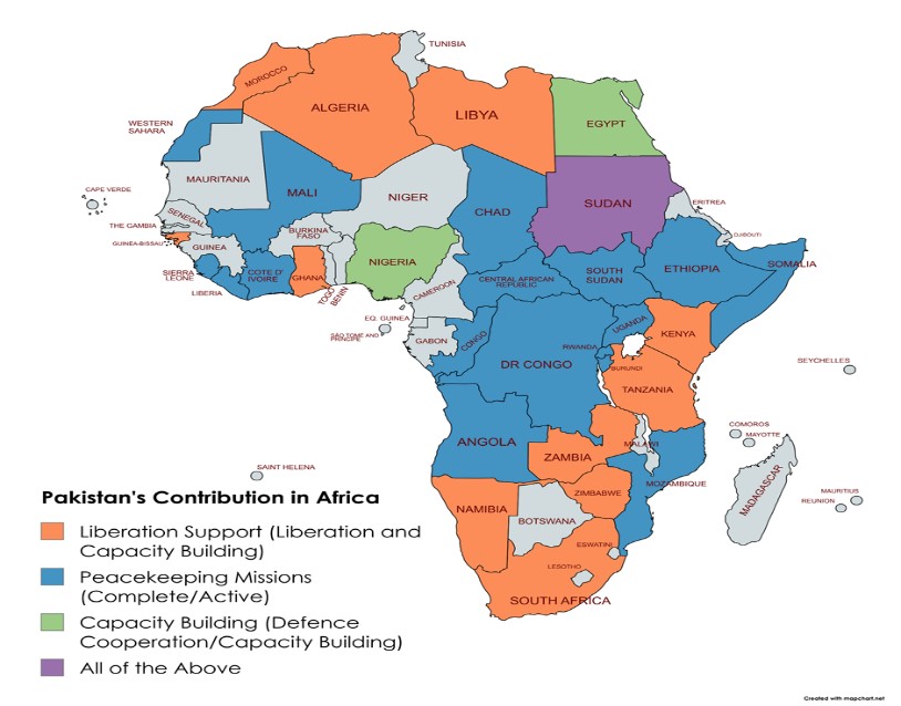 Pakistan has provided military personnel, advisors, and experts to African countries like Egypt, Zimbabwe, and Sudan, particularly during wartime and post-conflict reconstruction. In the 1970s, Pakistan offered military training and arms to Libya. After Zimbabwe’s independence in 1980, Pakistan played a key role in restructuring its air force, with Air Vice Marshal Azim Daudpota of the Pakistan Air Force (PAF) becoming its Commander in 1983.