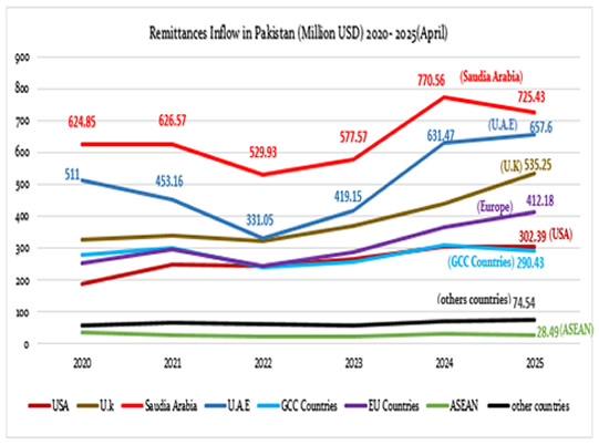 The graph depicts that Pakistan receives the highest remittances from the Middle East (Notably from KSA, U.A.E) driven by a larger concentration of migrant labour in the region. The State Bank of Pakistan in a press release reported ‘’Saudi Arabia as a top contributor as Pakistan remittances grow 38.6% and 3.8% on year-on-year and month-on-month basis’’. In contrast, other regions contribute relatively modest amounts, both in aggregate and on a per worker basis.