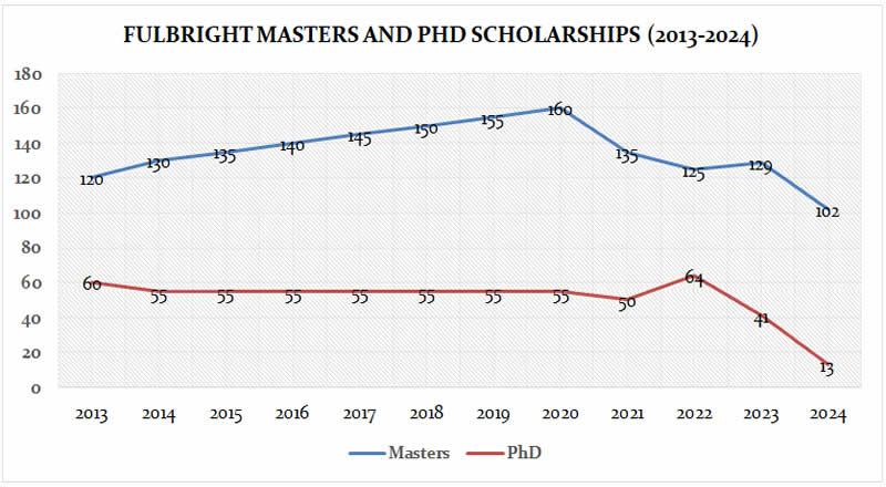 The graph 3 below shows the number of Masters and PhD Fulbright scholarships received by Pakistani nationals in the last decade.