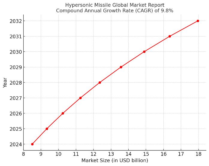 Rapid growth in the Hypersonic Missile market has been witnessed in recent years. By the end of this decade, it is expected to grow from US$8.5 billion in 2024 to US$18 billion in 2032, with an overall compound annual growth rate (CAGR) of 9.8%.