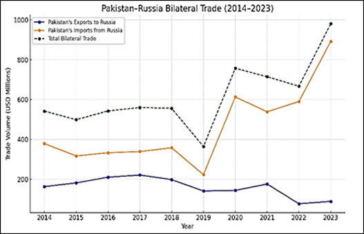 For Pakistan, present trade is import-driven with the balance favoring Russia. Pakistan mainly exports textiles, sports goods, medical instruments, and fruits to Russia, while it imports grains, crude oil, coal, and pulses.