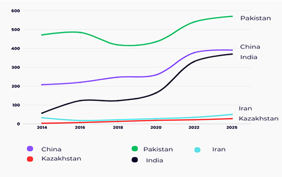 India has gradually increased its role, though it remains behind the top three partners. Kazakhstan’s share has stayed small but steady. Overall, the trajectory signals a reorientation of Afghan trade toward Iran and China, with Pakistan facing growing competition.