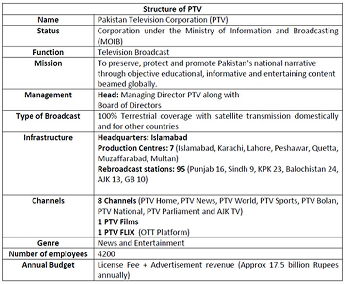 Managed by the Ministry of Information and Broadcasting (MOIB), PTV was primarily funded through a Rs35 license fee collected via electricity bills, generating around Rs10 billion annually, supplemented by fluctuating advertising revenue. However, collection was discontinued in June 2025.