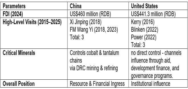 Capitalising on its geographic location, Rwanda has rebranded itself as “Africa’s Singapore.” Backed by US and Western support for stability and reform, Kagame has consolidated power despite criticism over political repression - earning him the label of the West’s “favourite autocrat.” Washington has institutionalised its partnership with Rwanda through the 2022 Status of Forces Agreement and the 2025 US-brokered DRC - Rwanda Peace Deal, highlighting Kigali’s role as a regional stabiliser. The deal aligns with US aims to curb regional instability, secure access to critical minerals, counter China’s influence, and strengthen its diplomatic foothold in Africa. USAID committed US$85 million to local projects.