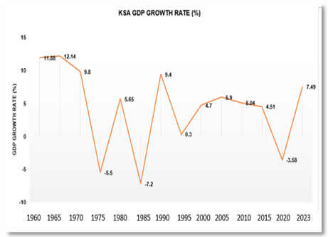 Several factors have contributed to KSA’s move toward economic diversification, including volatile oil prices, growing environmental concerns, and the global shift toward renewable energy sources, which has made KSA’s reliance on oil a point of vulnerability. As Graph 1 illustrates, KSA’s GDP growth trend reflects significant economic volatility, characterised by fluctuations over the decades. The country experienced rapid economic growth in the late 1960s, driven by an oil boom that significantly increased revenues.