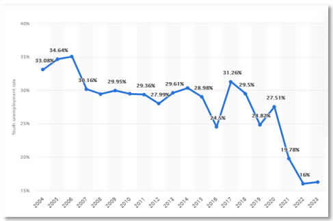 Another major factor behind KSA’s push to diversify its economy away from oil is the persistent challenge of youth unemployment. In the early 2000s, unemployment among young Saudis remained alarmingly high, highlighting deep-rooted structural issues within the labour market and the limitations of an oil-dependent economic model. As shown in Graph 2, the youth unemployment rate peaked at 34.64% in 2006 and remained stable in the subsequent years.
