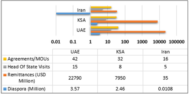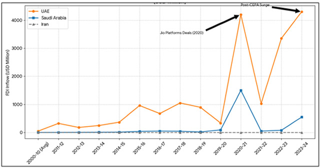 Graph 1: Comparative Indicators of India’s Relations with UAE, KSA, and Iran (2001-2025)