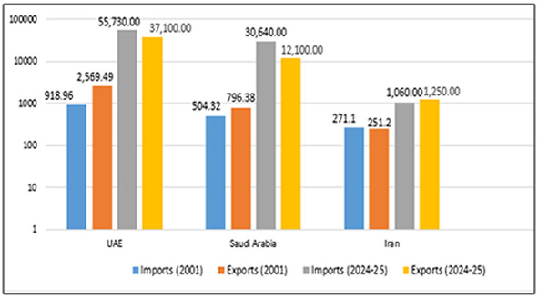 Graph 3: India Import & Export with UAE, KSA & Iran (2001-2025) Million USD