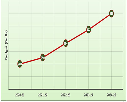 Benazir Income Support Programme (BISP) is the country’s flagship social protection initiative, administered by the Ministry of Poverty Alleviation and Social Safety. Over the years, BISP’s budget has increased considerably. For FY 2024-25, Rs 598.7 billion was allocated. However, total budgeted expenditure rose to Rs 716 billion by November 2025, reflecting a strong fiscal commitment to social development.