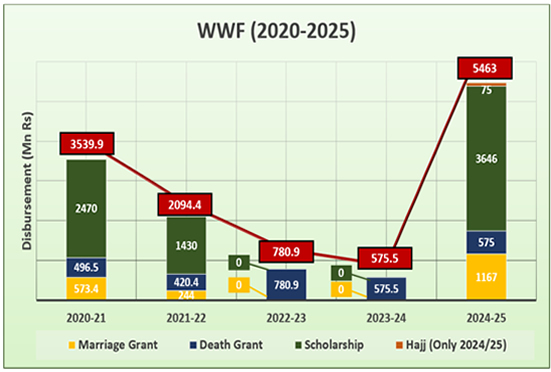 The Workers Welfare Fund (WWF), managed under the Ministry of Overseas Pakistanis and Human Resource Development, provides financial assistance in cases of workplace incidents. Figure 6 shows the amount disbursed under different cases from 2020-2025.