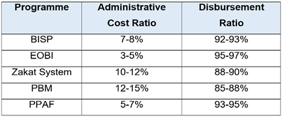 The administrative efficiency of federal social protection programmes varies according to their mandates, delivery models, and institutional structures. However, publicly available data show that most federal programmes maintain relatively low administrative costs compared to the volume of benefits delivered. A summary of administrative and disbursement ratios across major federal programmes is provided below.