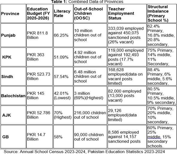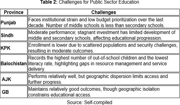 Public sector education serves as a foundation for national development by ensuring access to the majority of the population. Article 25-A of the Constitution of Pakistan guarantees compulsory education from age 5 to 16, up to Senior Secondary level, yet millions of children remain out of school. This insight is a comparative analysis of the provincial public education system of Pakistan, assessing disparities in enrollment, out-of-school children, budget, teachers and structure, while suggesting corrective reforms.