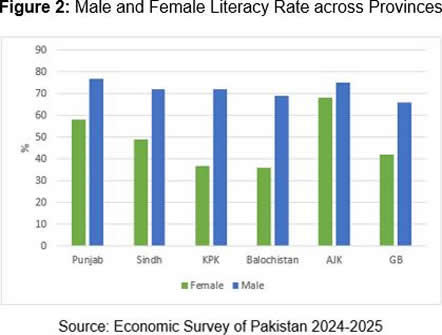 The overall literacy rate remains at 60% while there are notable disparities among provinces, with Punjab having the highest literacy rate at 66.25%, followed by Sindh at 57.54%, KP at 51.09%, Balochistan at 42.01%, AJK at 70% and GB at 58%.