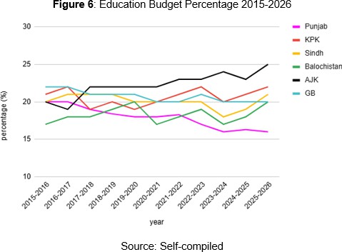 The Education budget also indicates provinces' priority towards public education. Punjab, despite allocating the highest education budget in 2025, shows a declining budget trend over the past decade (Figure 6). KP, Balochistan and AJK have shown moderate growth in their education budgets. Sindh’s minimal increase points to stagnant investment, a trend also seen in GB. Provincial governments show uneven prioritisation of education, with most investing steadily, while Punjab exhibits a declining trend.