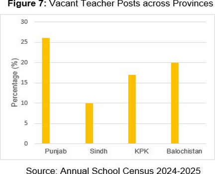 Punjab’s 26% vacant teacher posts demand urgent hiring and strict attendance monitoring. In KP and Balochistan, 17.7% and 20% teacher posts are vacant, respectively. Sindh has 10% vacant teacher posts, while no credible data is available regarding the number of vacant posts in AJK and GB; they also face staffing gaps issues. This shows that teacher shortages are highest in Punjab, moderate in Balochistan and KP, lower in Sindh, with staffing gaps in AJK and GB.