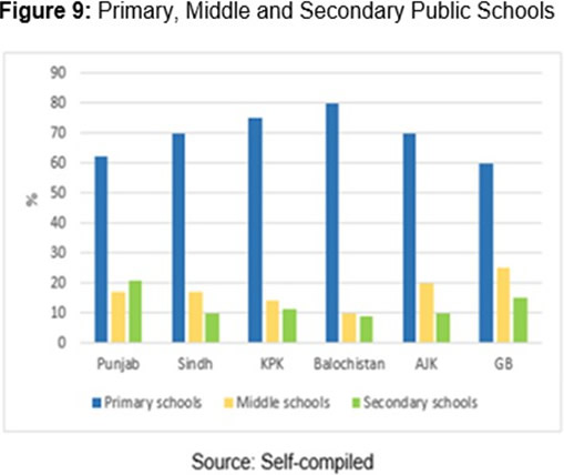 Public schools in Pakistan have an uneven structure across primary, middle, and secondary levels, as shown in Table 1 and Figure 9. Balochistan has the highest share of primary schools, followed by KP, Sindh, and AJK, showing limited availability of middle and secondary schools. GB has the highest number of middle schools, while Punjab has the largest share of secondary schools. Notably, Punjab is the only province where secondary schools outnumber middle schools, reflecting stronger secondary-level capacity but a disruption in the progression from primary to secondary education.