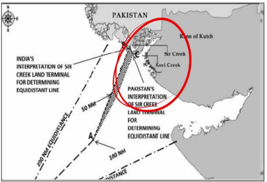 The Sir Creek dispute centres on whether the border between Sindh and Gujarat lies within the estuary or on its eastern bank. If the border is within the estuary itself, then both India and Pakistan will have ownership of the waters of the Sir Creek. If the border is determined to be the eastern bank of the Sir Creek estuary, Pakistan has full ownership of the creek, and India has no access to its waters.