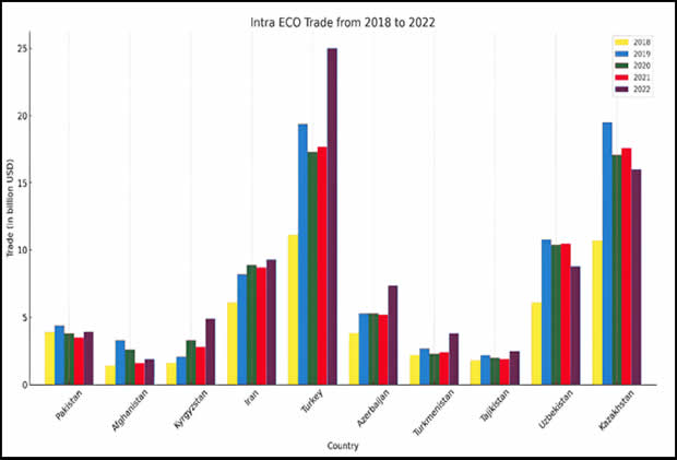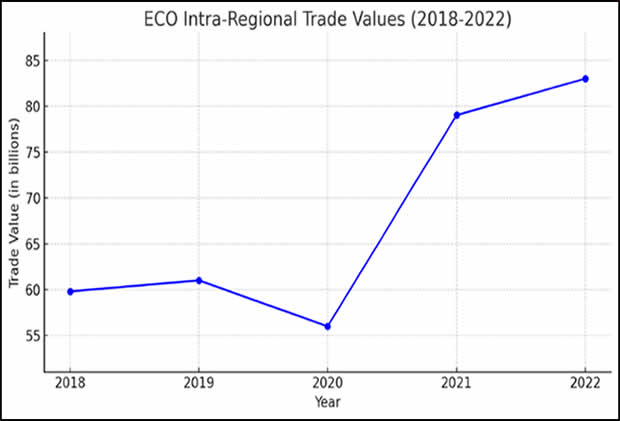 Graph 1 shows an increase in total ECO regional trade from US$59 billion in 2018 to US$83 billion in 2022. Although total intra-regional trade has increased steadily from 2018 to 2022, the ECO's collective intra-regional trade is only 8% (US$83 billion) of its total trade value with the outside world (US$1037 billion).