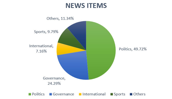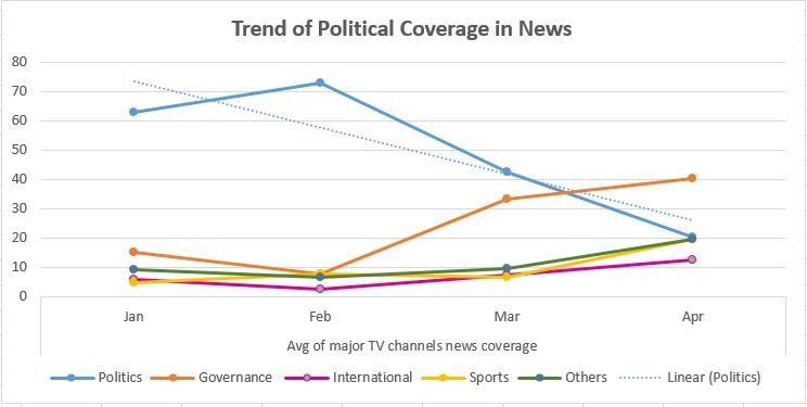March witnessed a shift from politico-electoral discussions to governance. News coverage of politics declined by 30% and was 42.55%. This decline in political coverage in March offers a glimmer of hope for a more balanced news landscape. Notably, with the decrease in political coverage, there had been a steady increase in coverage of governance and international issues (Figure 2). Furthermore, there has been an 85% decline in direct political discussions in prime-time talk shows. Still, the persistence of political overtones in matters related to governance paved the way for negative tendencies in the news.