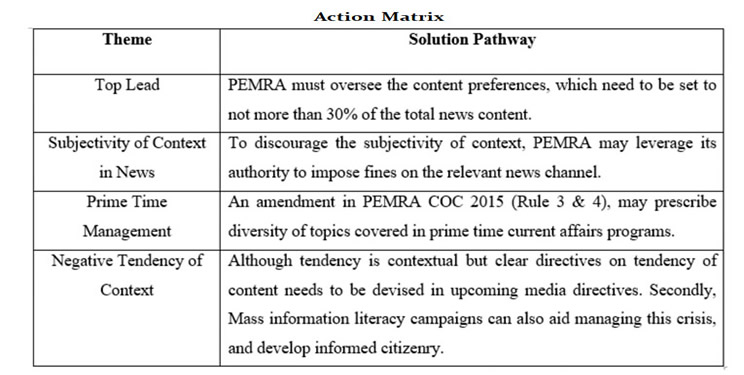 In light of the above assertions, it would not be wrong to say that news media in Pakistan is architecting its demise, where lack of diversity and innovation is rotting its roots. In the words of Jon Stewart, ‘media sells sensation because it hasn’t tried anything else’. In the presence of many news stories, prioritising the sensational ones decapitates audiences’ informed decision-making. Under such conditions, there is a clear need for a realistic content preference scheme that reflects accuracy and truthfulness and caters to the citizenry's information needs. There is an opportunity for positive change in the media landscape. As the prescribed action matrix states, this change can be brought about through concerted efforts by the regulator (PEMRA) and media houses.