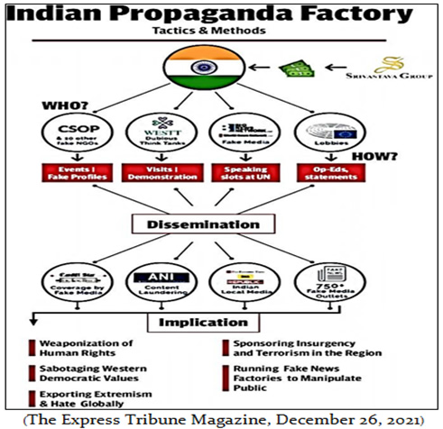 Another instance of India maligning Pakistan on the international stage is "Srivastava Group", which has its headquarters in New Delhi. It runs a website of fake news outlets, including "EP Today", a magazine claiming to be published by the European Parliament, Brussels. It promotes Indian interests and discredits Pakistan. Similarly, in May 2020, the advent of the "EU Chronicle" brought forth a slew of fake media outlets, prominent among them were "Times of Geneva" and "4 News Agency". The discernible lack of journalistic integrity, coupled with an apparent absence of transparency within the EU Chronicle's operations, suggests its function as a propaganda apparatus serving Indian objectives, primarily focused on disseminating misinformation against Pakistan.