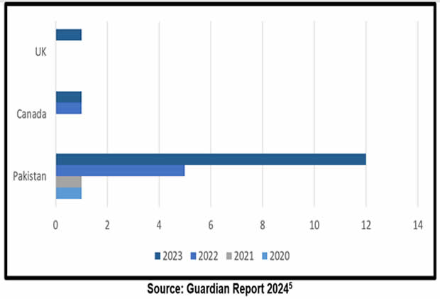 In continuation of this new assertive and aggressive strategy, India has repeatedly targeted Sikhs and Kashmiris residing in Pakistan in a series of assassinations, which have raised serious concerns regarding the breach of security, sovereignty, and territorial integrity of the states like the US, Canada and Pakistan. The Indian government often cites national security concerns as a rationale for these assassinations. The following graph shows countries where India has recently targeted the individuals.