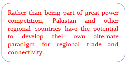 Rather than being part of great power competition, Pakistan and other regional countries have the potential to develop their alternate paradigm for regional trade and connectivity. Afghanistan's economic development relies heavily on trade with neighbouring countries, including Pakistan, China, Russia, Central Asian Republics (CARs), and Iran, with critical projects like CASA-1000 (Central Asia-South Asia), the Uzbekistan railway, and the TAPI (Turkmenistan-Afghanistan-Pakistan-India) pipeline project. In this context, the Economic Cooperation Organization's (ECO) support for Afghanistan transit trade and infrastructure investments can boost regional connectivity, growth, and stability, fostering cooperation among its members like Pakistan, Afghanistan, CARs, Turkey, and Iran.