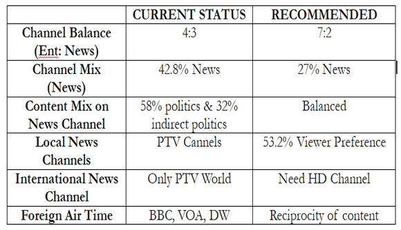 The channel mix is misleading due to the disconnect between viewership and broadcasters’ preferences. Despite 70% entertainment and 19% news viewership, the channel mix (Figure 1) shows 31 private news TV channels and 42 entertainment channels. Currently, the entertainment-to-news ratio is 4:3, which preferably should be 7:2.