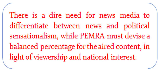 To conclude, news media needs to balance information, education and entertainment. News should not be synonymous with political coverage; instead, there should be a fair balance of subjects. The prime time (6 PM to 11 PM) content needs a regulatory overhaul, where PEMRA must prescribe a percentage for balanced content. In this regard, political tenor should be limited to not more than 30% of the aired content, as recommended in Figure 2. Hence, public confidence in news is restored only through diversification of aired content, not sensationalism.